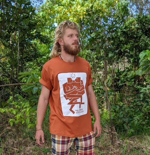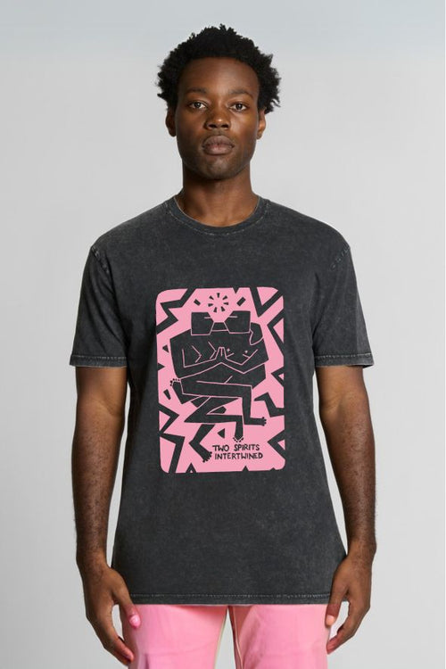 Man stands proudly with his hands in the pockets of his rich burgandy red hooded jumper. On the front of the jumper is a black graphic art print of two figures intertwined together. It reads Two Spirits Intertwined. On the sleeves it reads 'You Are Free' on one, and 'Genkskstasy' on the other.