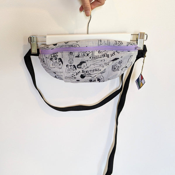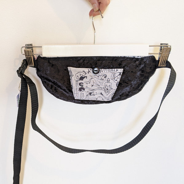 The last of our Beautiful Pleasures light cotton fabric made into a zero waste bum-bag. Featuring satin lining inside, a secret pocket, and black velvet on the back side of the bag for a bit of extra sensual fun, just for you.